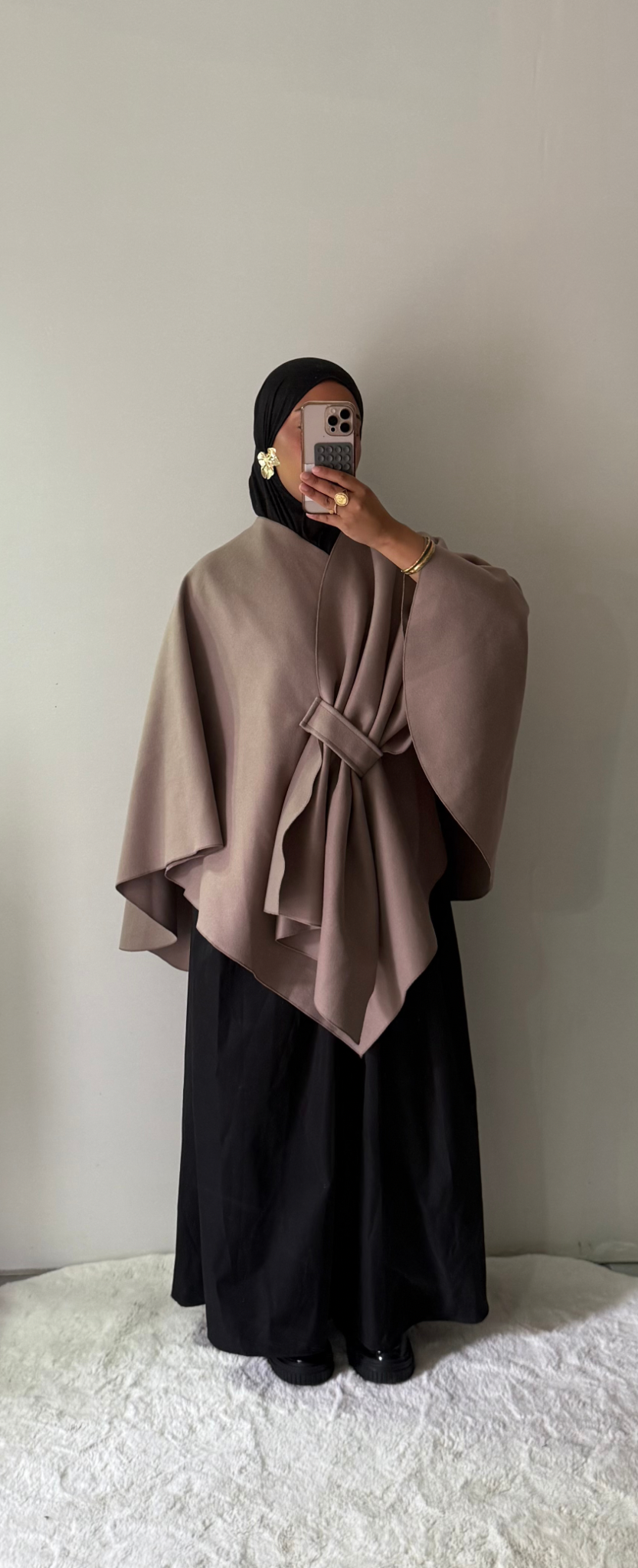 Une version plus marquée et habillée de la cape, avec un nœud large structuré à la taille.