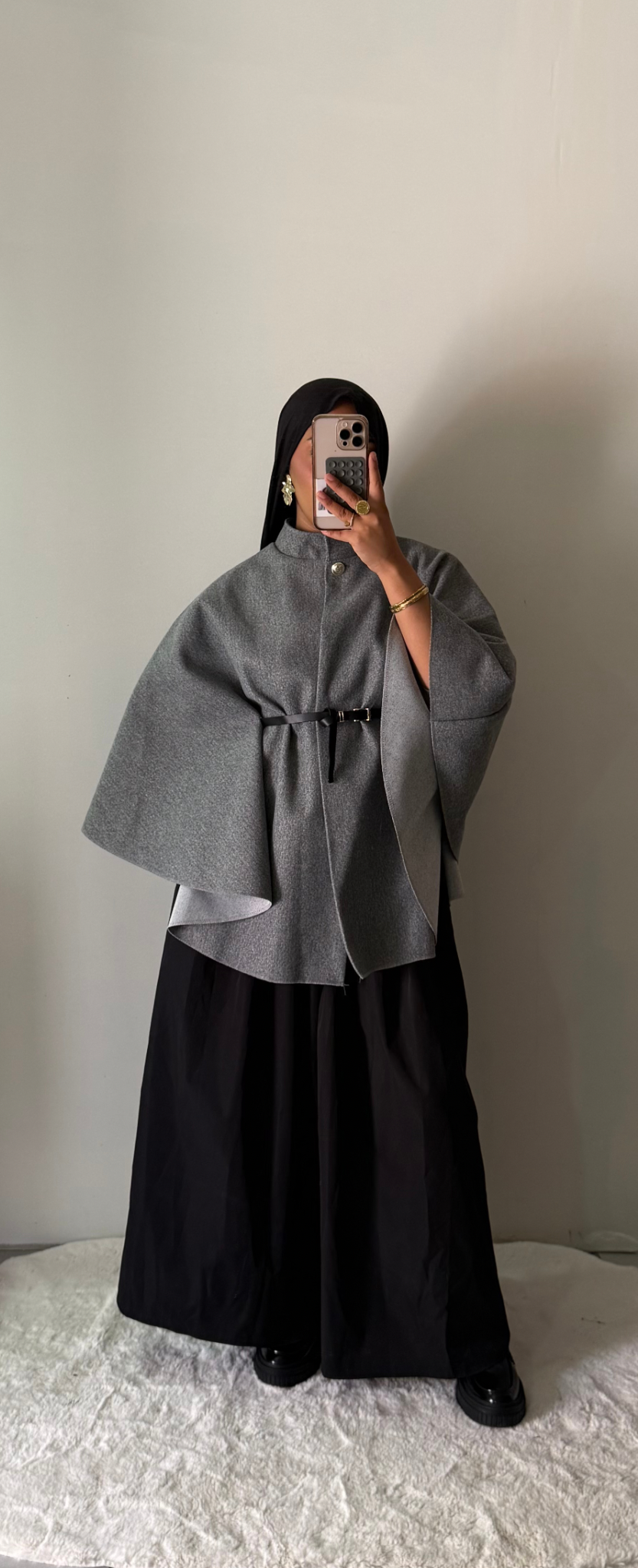 Modèle ample et travaillé, cette cape structurée se ferme au col par un bouton discret et se cintre à la taille avec une ceinture fine.